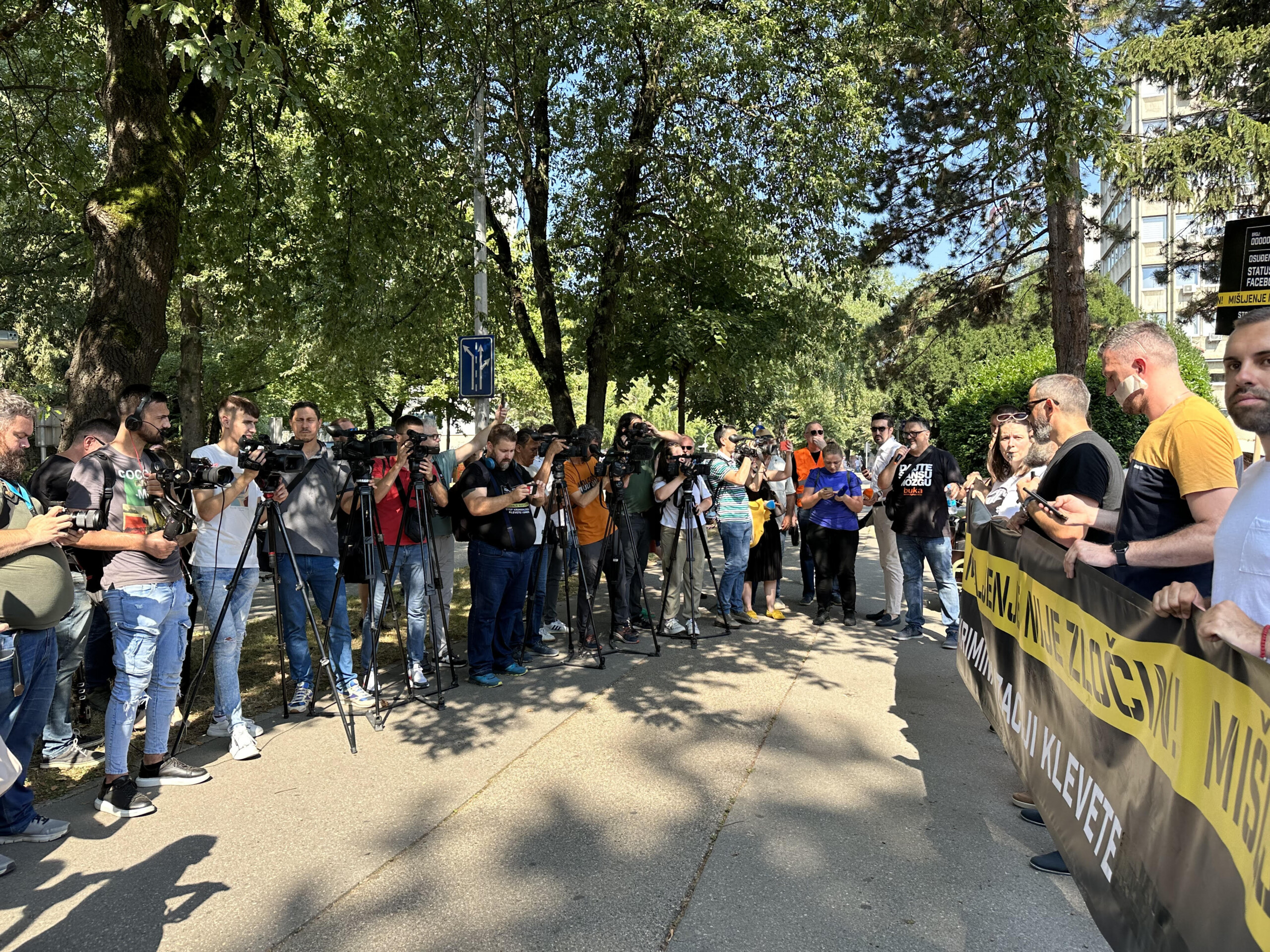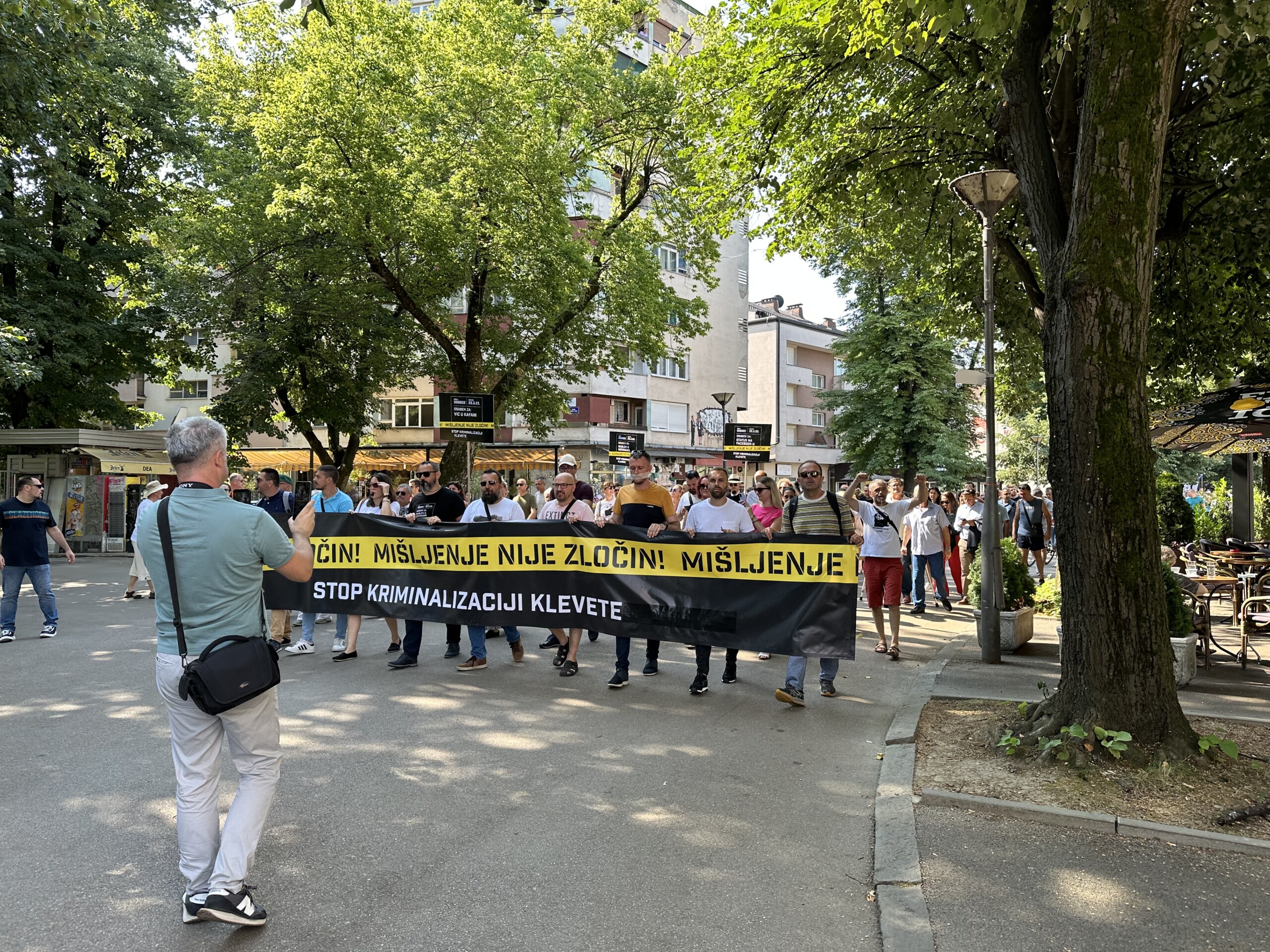 Banja Luka, 18. jul 2023. godine – Predstavnici medija, aktivisti i brojni građani okupili su se jutros u znak protesta na Trgu Krajine i održali protestnu šetnju do Narodne skupštine Republike Srpske u kojoj poslanici danas raspravljaju i glasaju o uvođenju klevete Krivični zakonik RS.