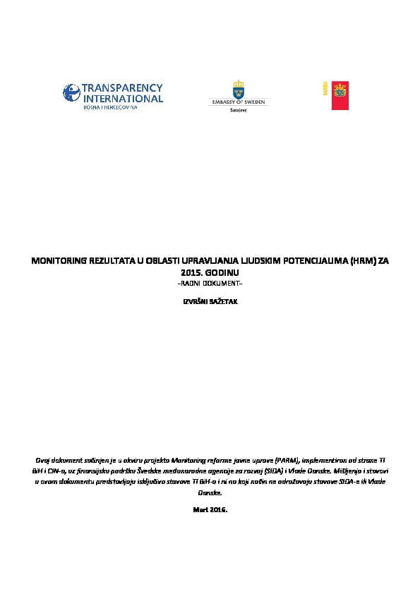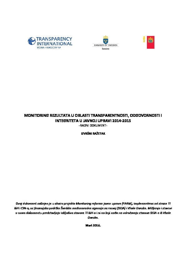 Sarajevo, 14. mart 2016. Transparency International u Bosni i Hercegovini (TI BiH) danas je predstavio rezultate drugog monitoringa reforme javne uprave u tri oblasti: upravljanje ljudskim resursima, javne finansije i transparentnost, odgovornost i integritet.