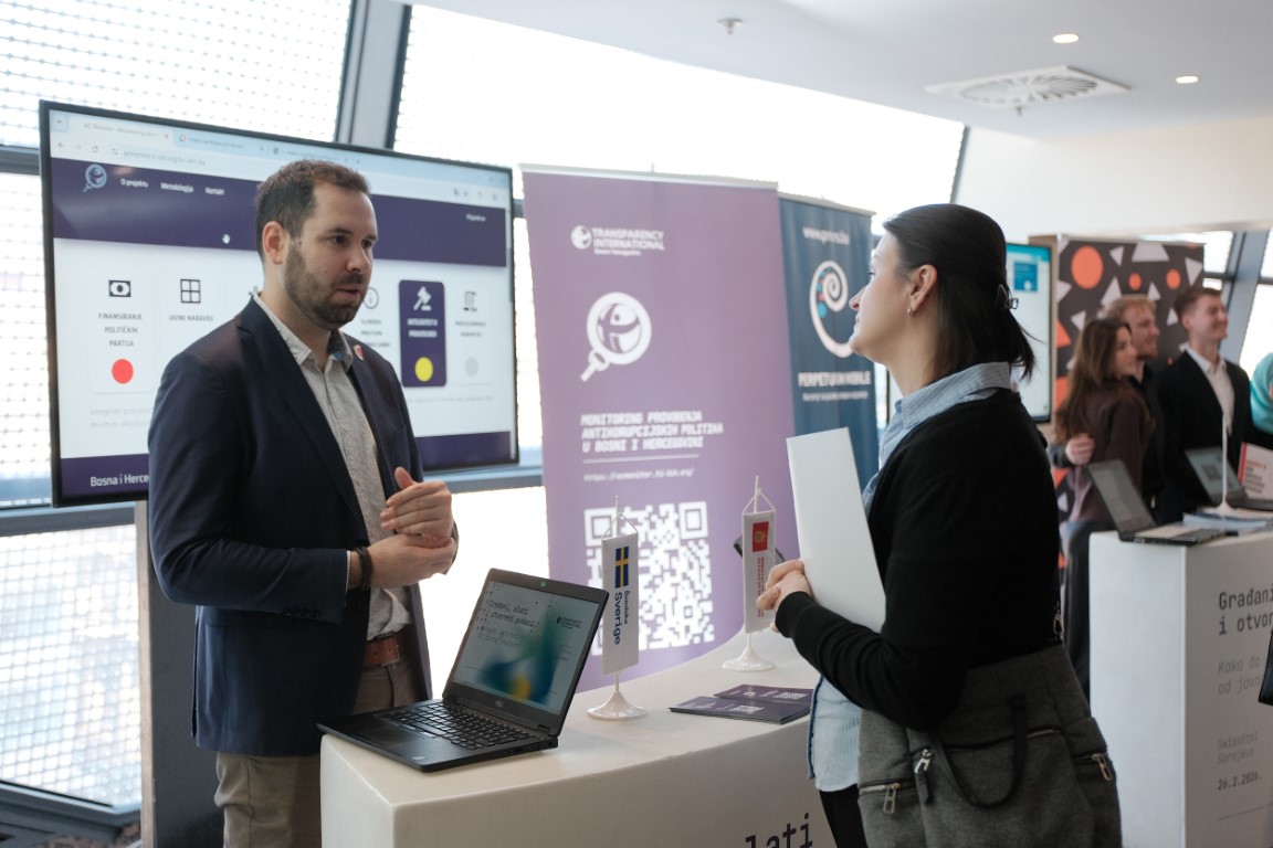 Sarajevo, 26. februar 2026. godine – Za efikasnu borbu protiv korupcije ključan je nadzor nad trošenjem javnog novca a svima koji žele da prate i kontrolišu rad vlasti Transparency International u BiH predstavio je 13 baza podataka koje pomažu otkrivanju nepravilnosti. Na ovim platformama mediji, organizacije civilnog društva, aktivisti i svi zainteresovani građani mogu saznati kako se troši javni novac i koliko ga odlazi na firme povezane sa izabranim zvaničnicima jer gotovo 36% onih koji su nakon opštih izbora prijavili vlasništvo u privatnim preduzećima ima poslove sa državom.