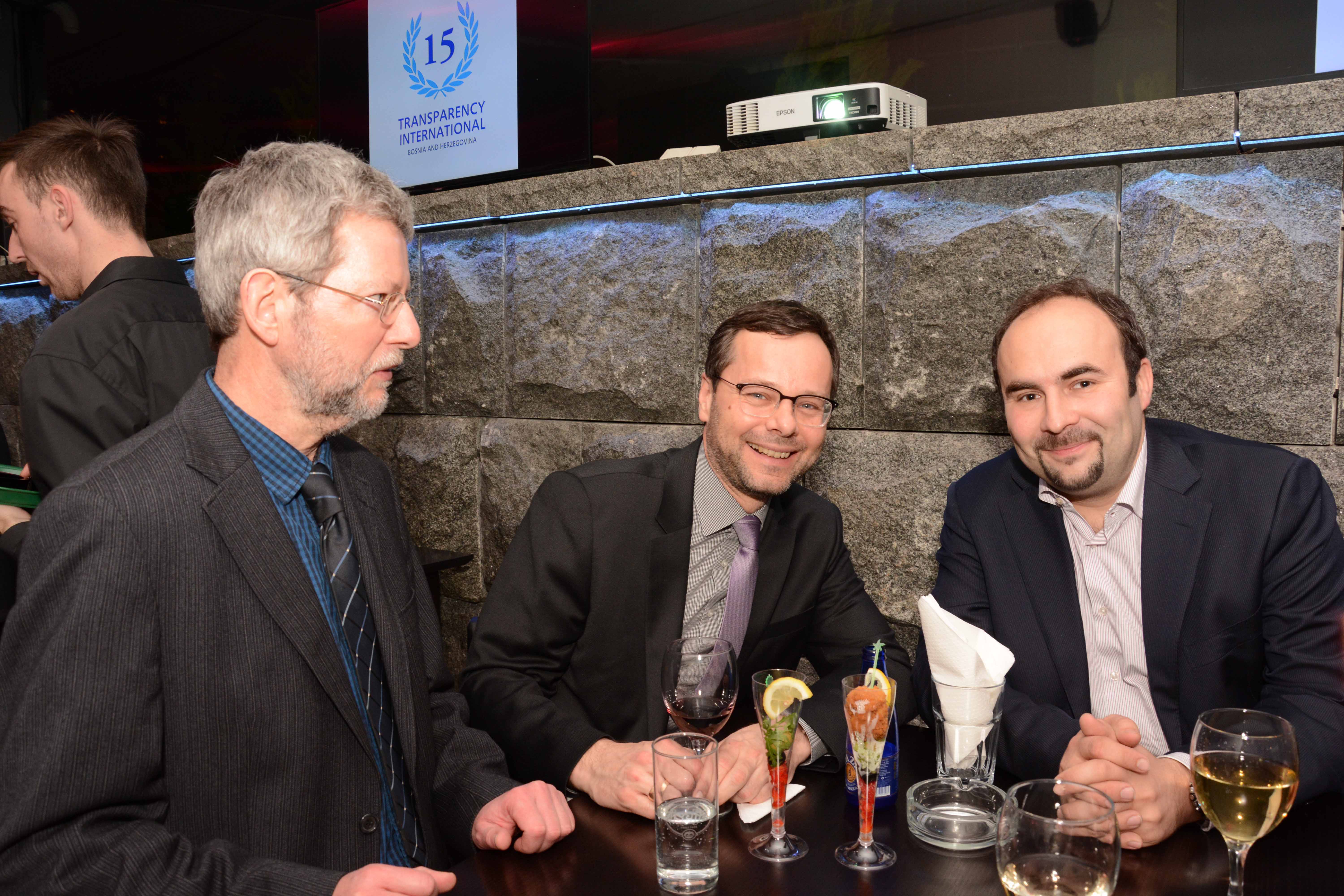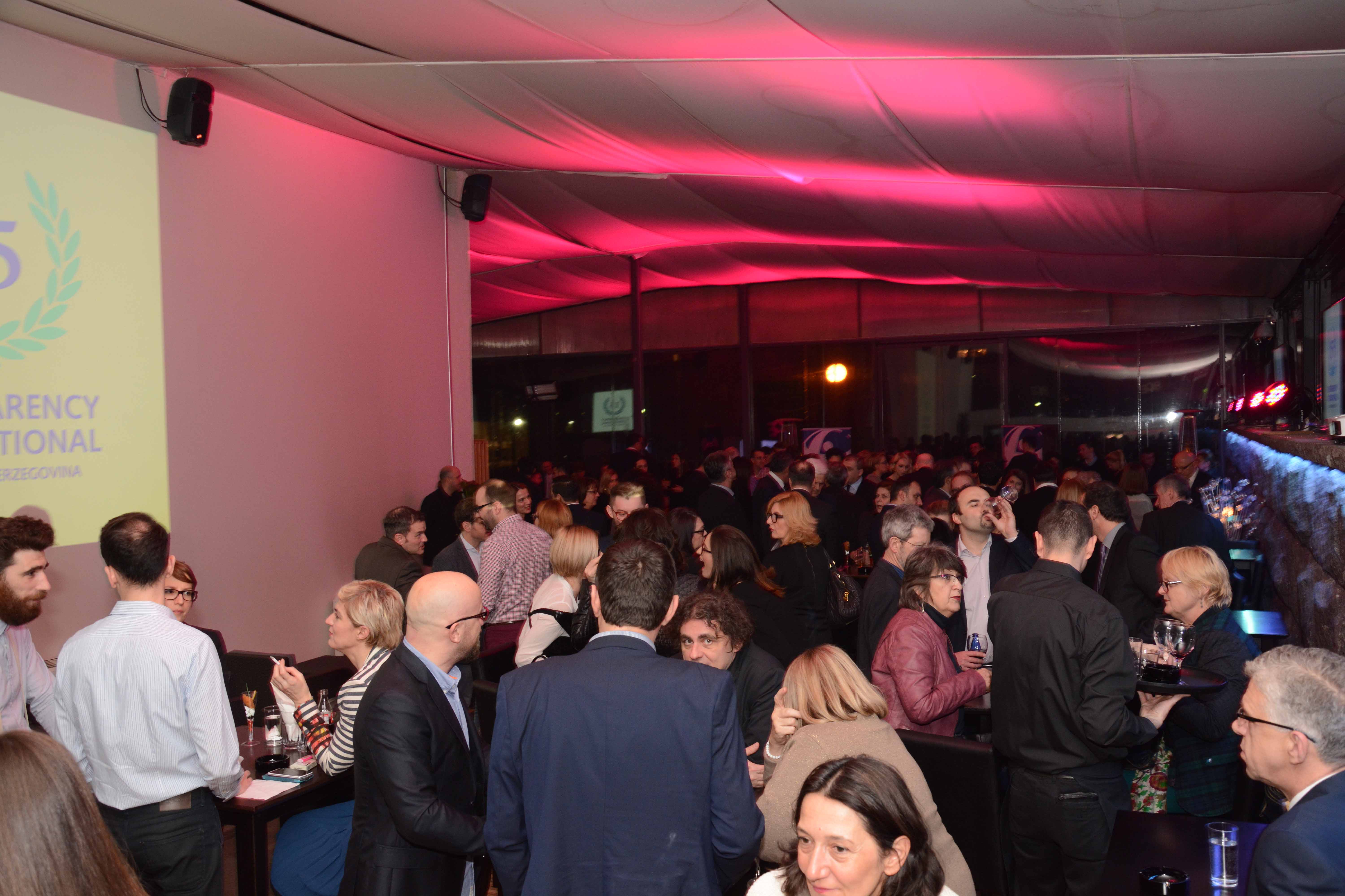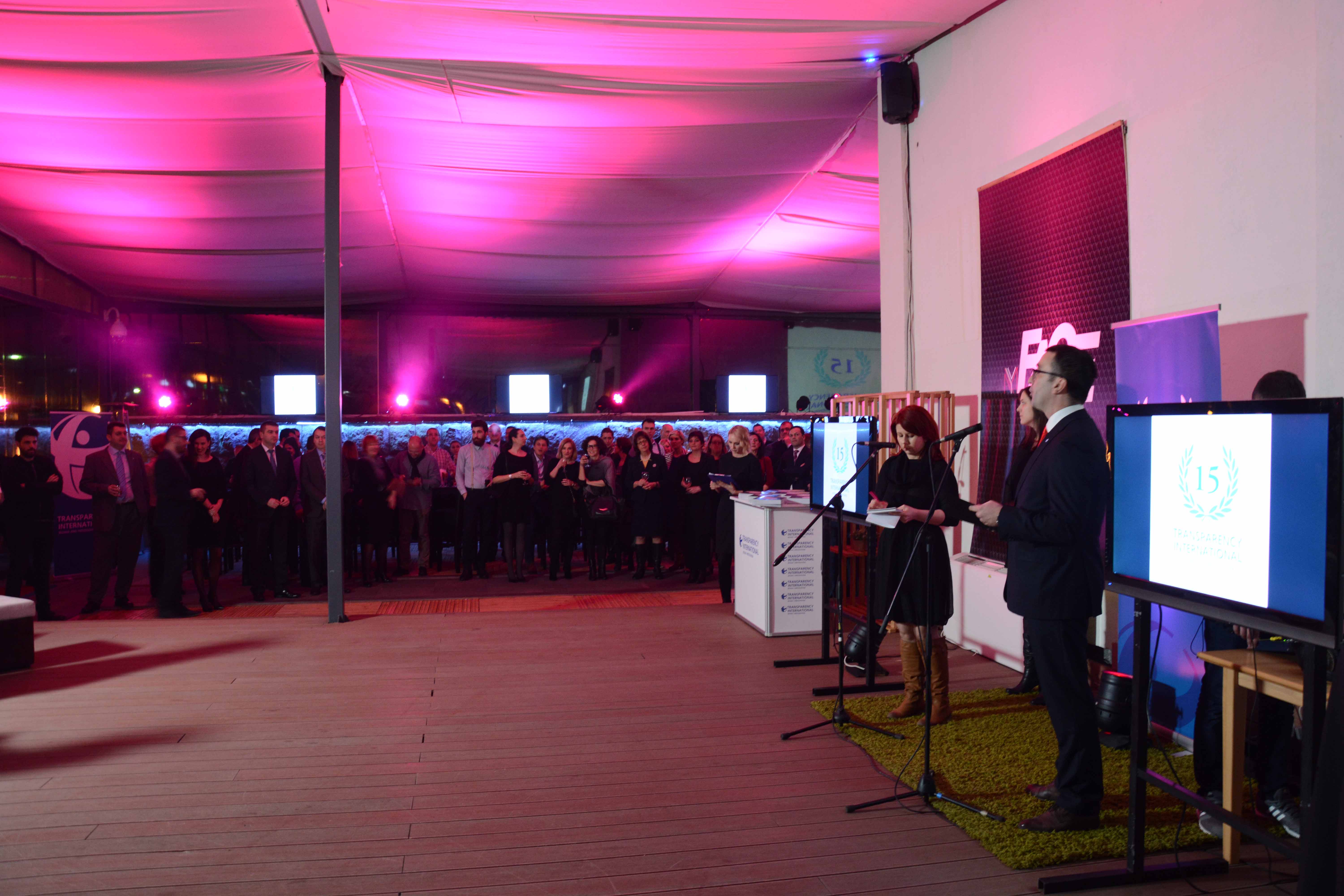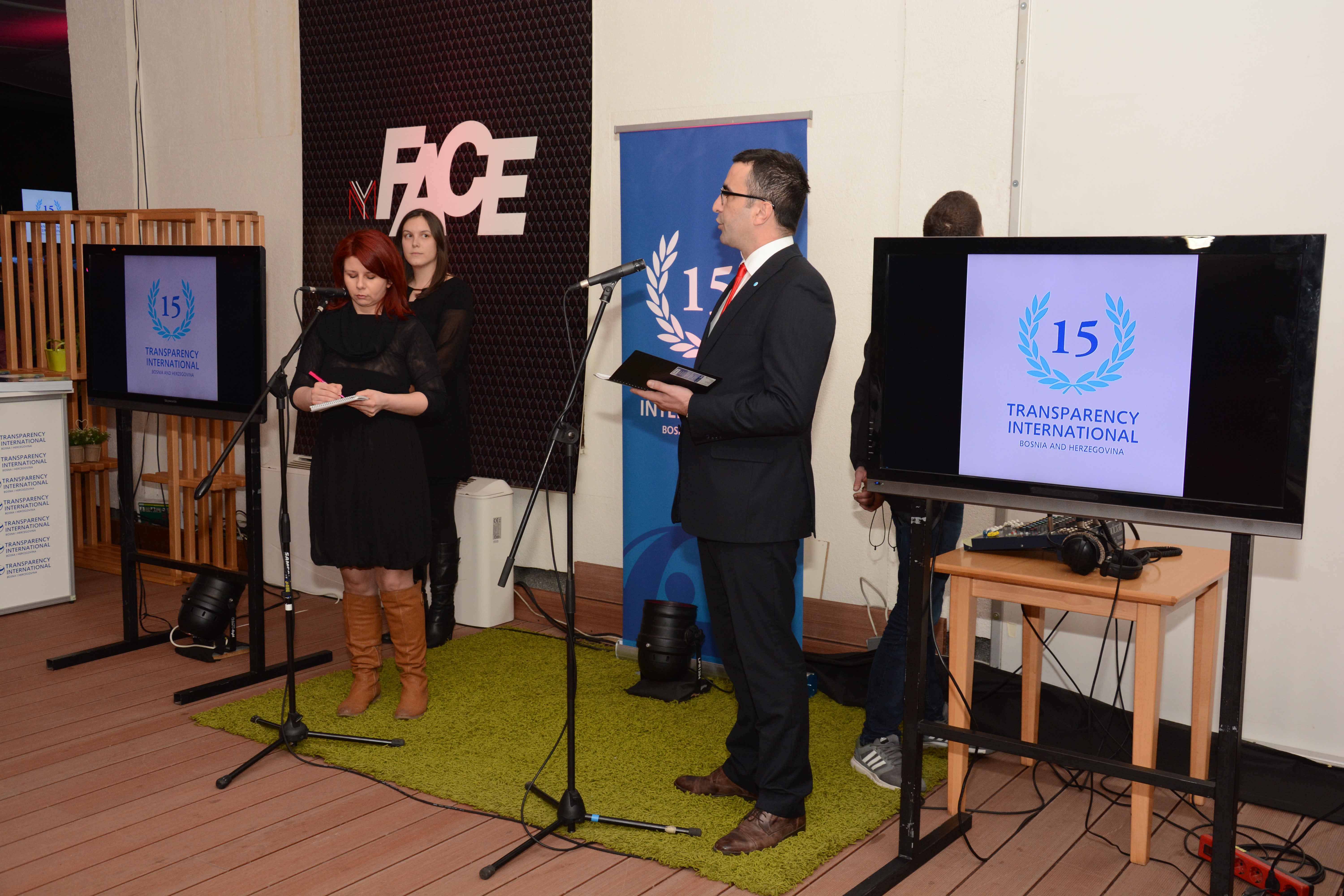 Transparency International u Bosni i Hercegovini obilježio je 15 godina svog rada organizujući prijem koji je održan 18. februara 2016. godine u Sarajevu. TI BiH je na prijemu okupio predstavnike diplomatskog kora, institucija na svim nivoima BiH, članove organizacije, civilno društvo, medije, kao i veliki broj saradnika i prijatelja organizacije. Predstavnici TI BiH, Srđan Blagovčanin, predsjedavajući Odbora direktora, i Lejla Ibranović, v.d. izvršnog direktora, su, obraćajući se prisutnima, izrazili zahvalnost na podršci organizaciji tokom njenog dugogodišnjeg rada, ali i informacije o radu TI BiH tokom 2015. i planovima za budućnost. Podršku ogranku TI u BiH dala je i Cornelia Abel, koordinator za Jugoistočnu Evropu u Sekretarijatu TI u Berlinu, naglasivši kako je TI BiH jedan od najjačih ogranaka ove organizacije u regionu i Evropi.